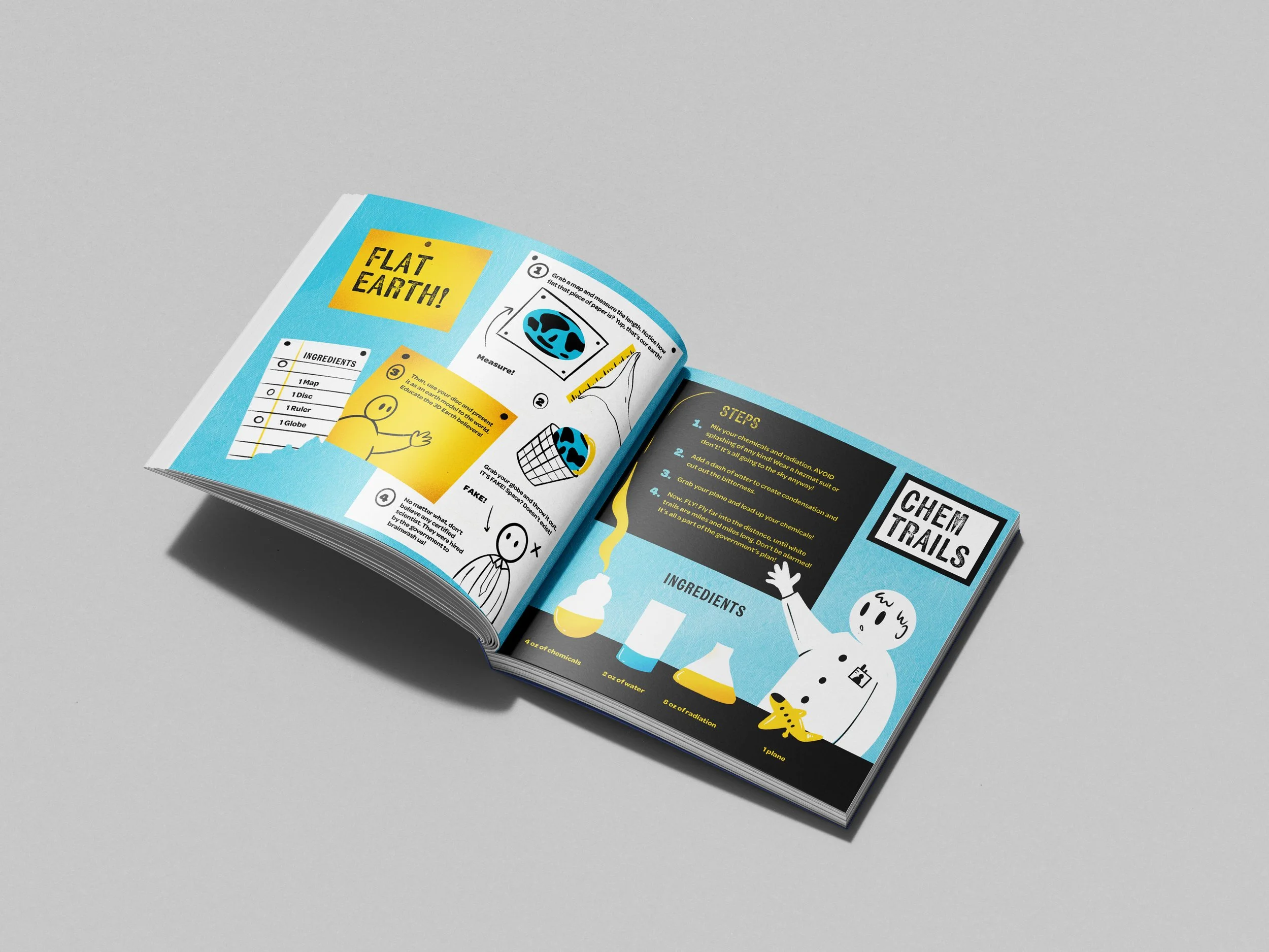 A fun, silly booklet about popular conspiracy theories in the U.S. After further research, I tailored each recipe to each theory. I used Procreate and InDesign to create my illustration and design.